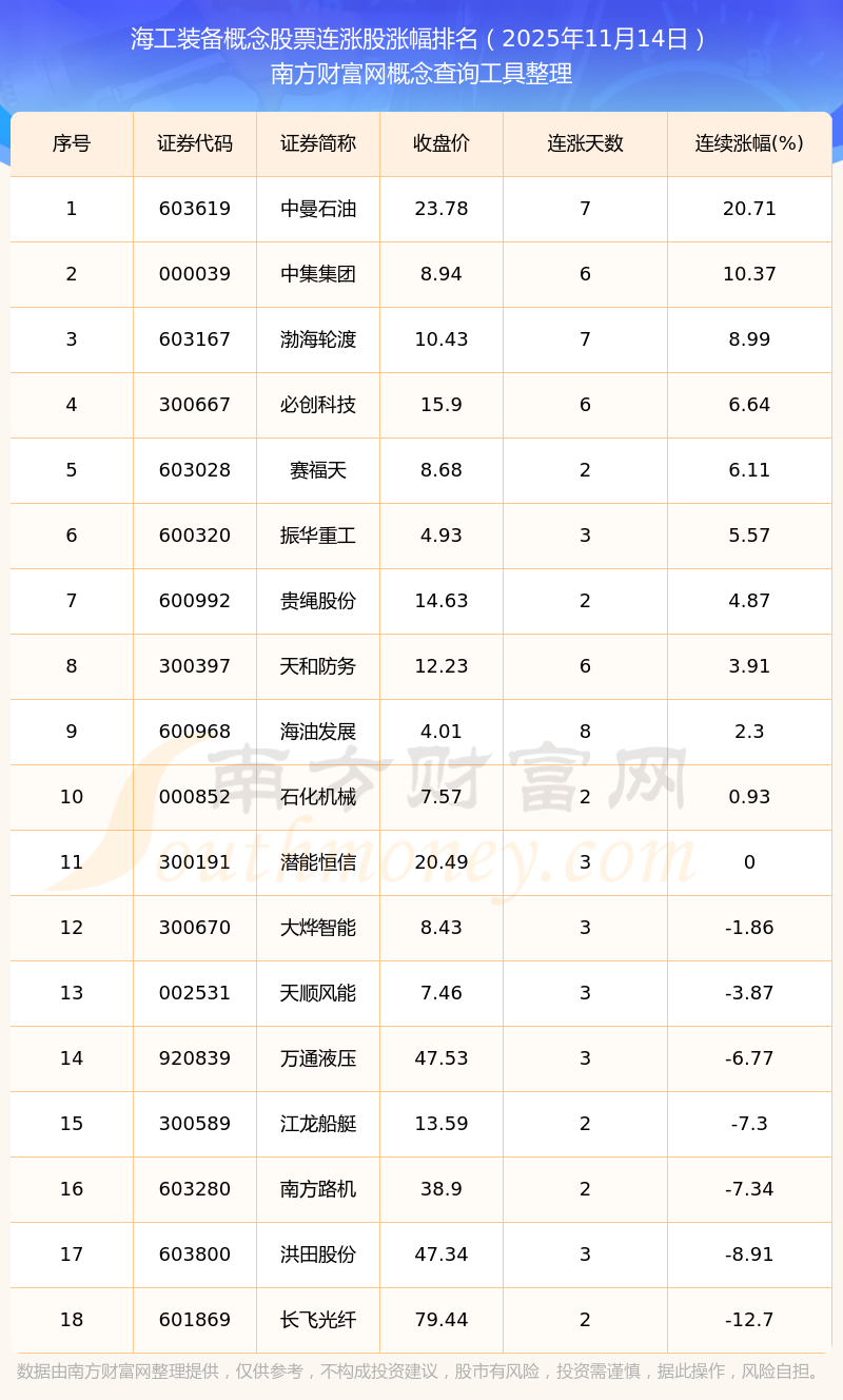 2025年11月14日海工裝備概念股票連漲股漲幅排名