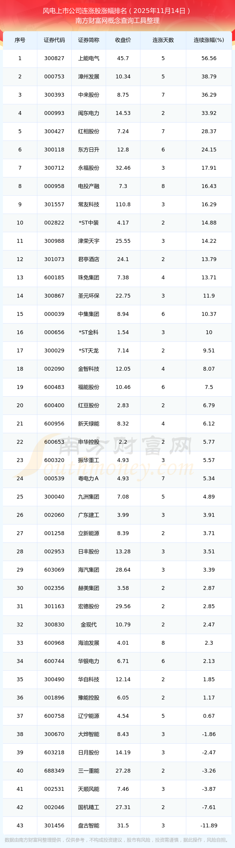 2025年11月14日風(fēng)電上市公司連漲股漲幅排名