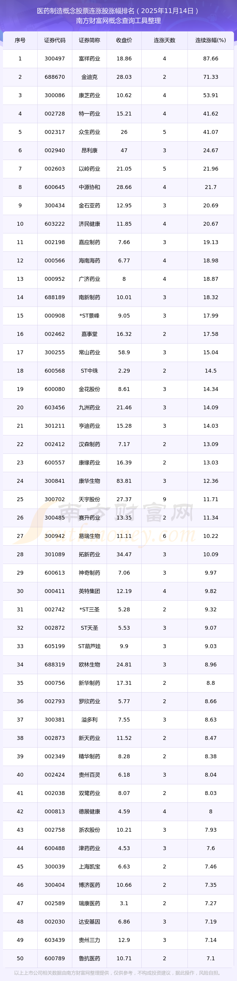 2025年11月14日醫(yī)藥制造概念股票連漲股漲幅排名
