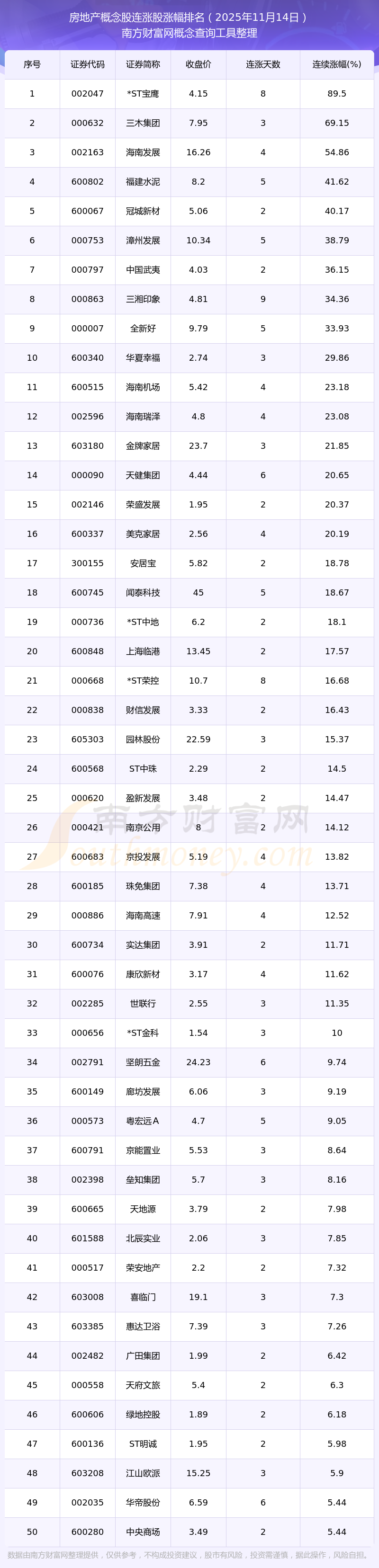 2025年11月14日房地產(chǎn)概念股連漲股票漲幅排名
