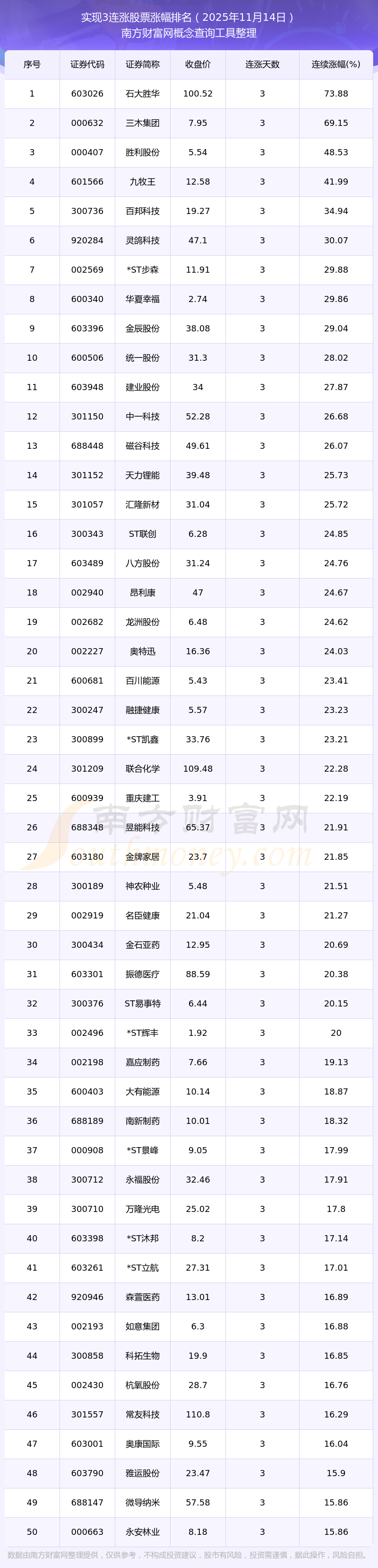 根據(jù)南方財富網概念查詢工具數(shù)據(jù)統(tǒng)計,截止2025年11月14日收盤,共有219只個股實現(xiàn)3天連漲。其中連續(xù)漲幅較大的個股有石大勝華、三木集團、勝利股份等,連續(xù)漲幅分別為73.88%、69.15%、48.53%。