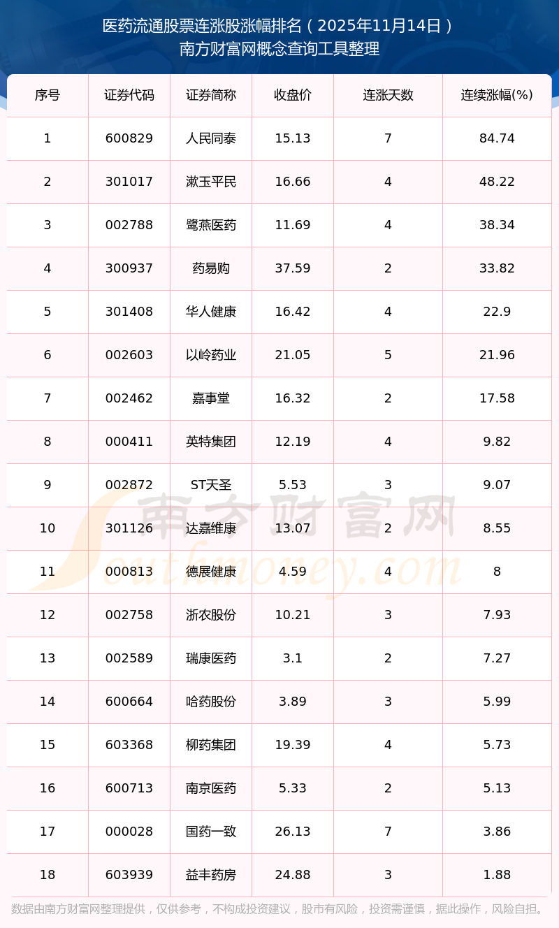2025年11月14日醫(yī)藥流通股票連漲股漲幅排名