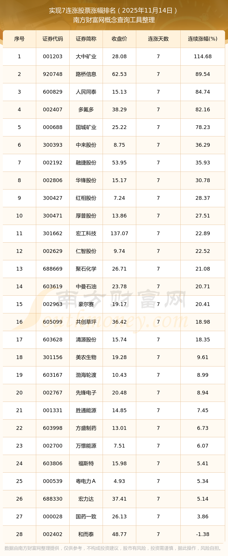 今日股市行情:28只個股實現(xiàn)7連漲(2025年11月14日)