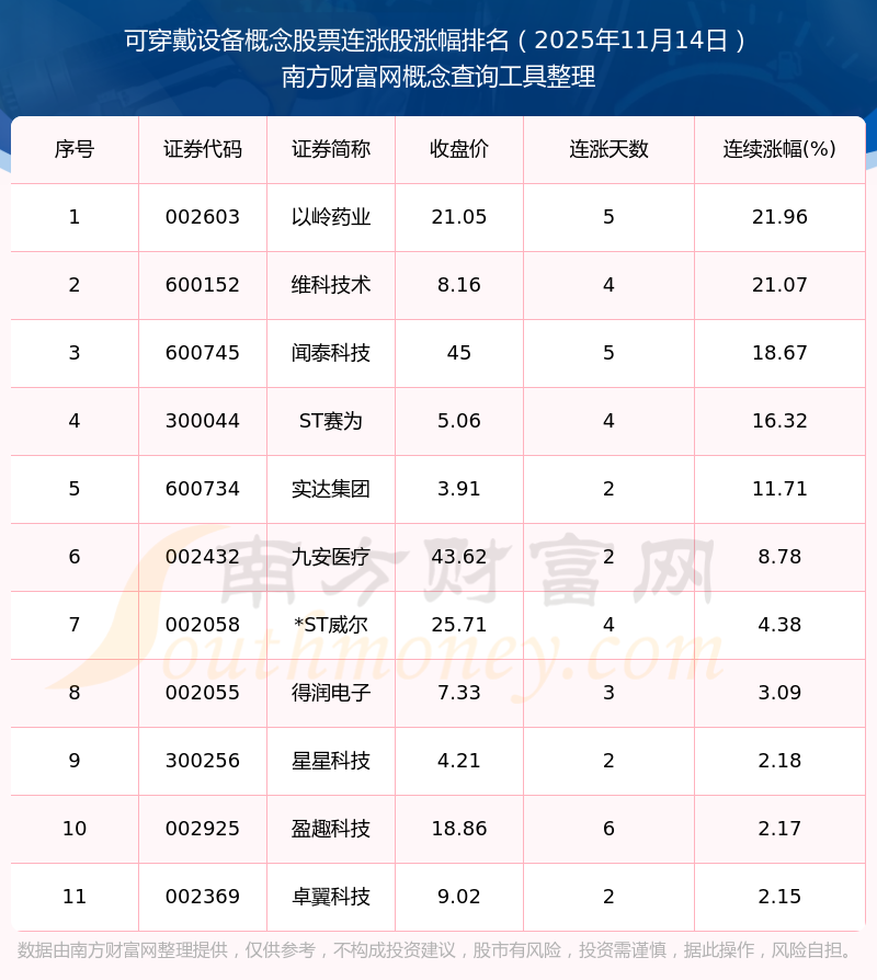 2025年11月14日可穿戴設(shè)備概念股票連漲股漲幅排名