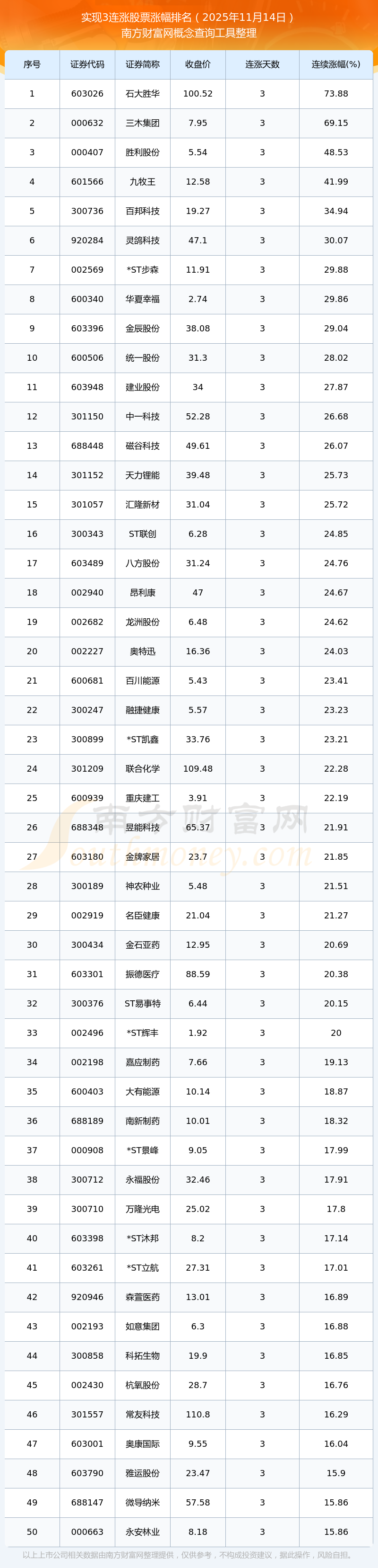 2025年11月14日實(shí)現(xiàn)3連漲股票漲幅排名