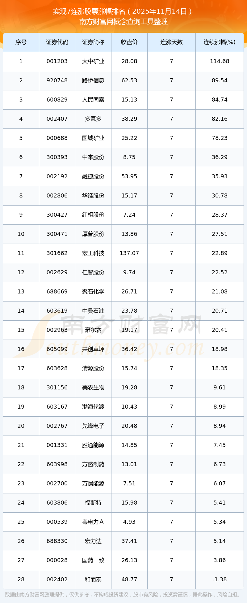 2025年11月14日實(shí)現(xiàn)7連漲股票漲幅排名
