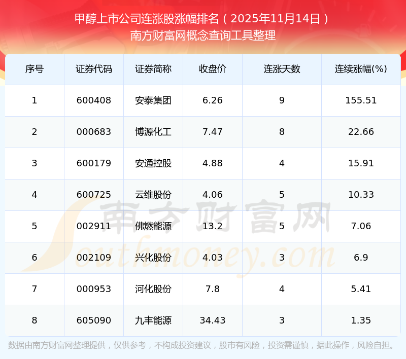 2025年11月14日甲醇上市公司連漲股漲幅排名