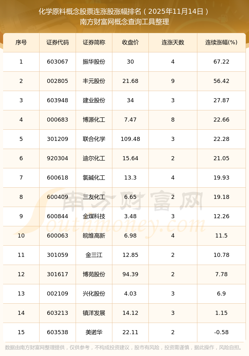 2025年11月14日化學(xué)原料概念股票連漲股漲幅排名