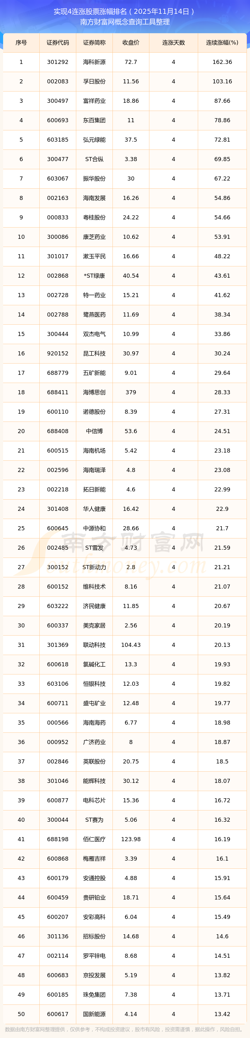 2025年11月14日實(shí)現(xiàn)4連漲股票漲幅排名