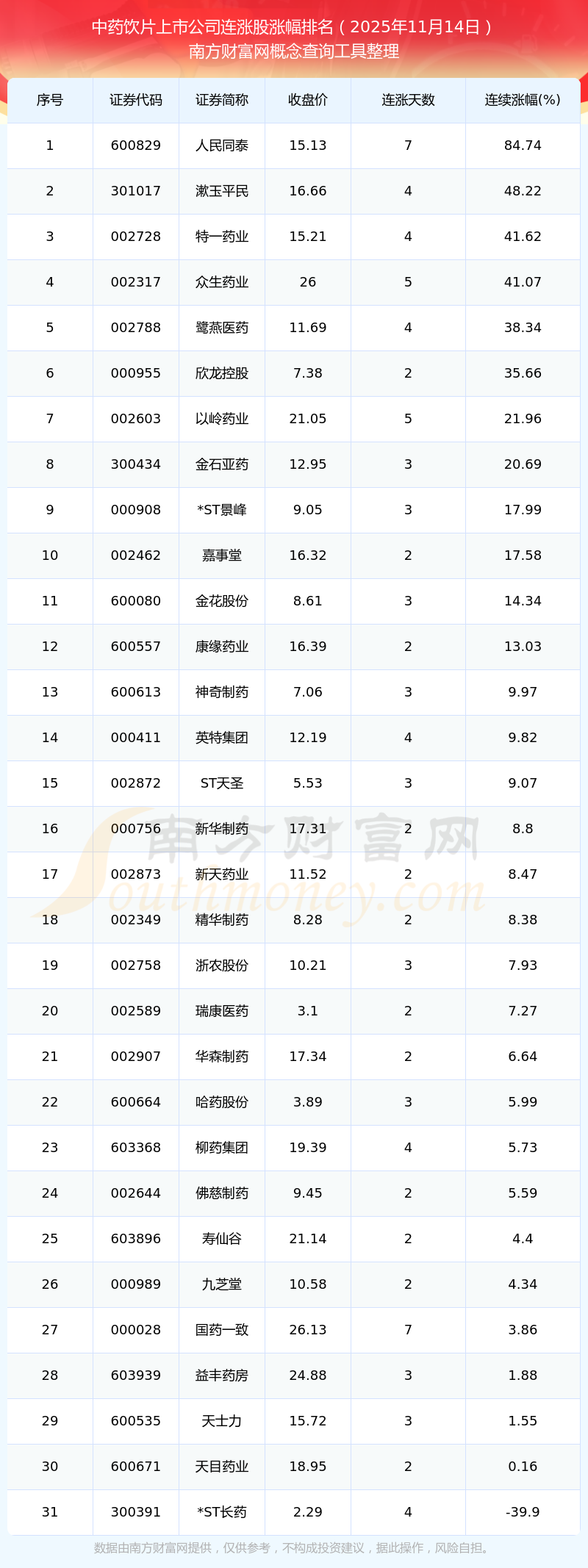 2025年11月14日中藥飲片上市公司連漲股漲幅排名