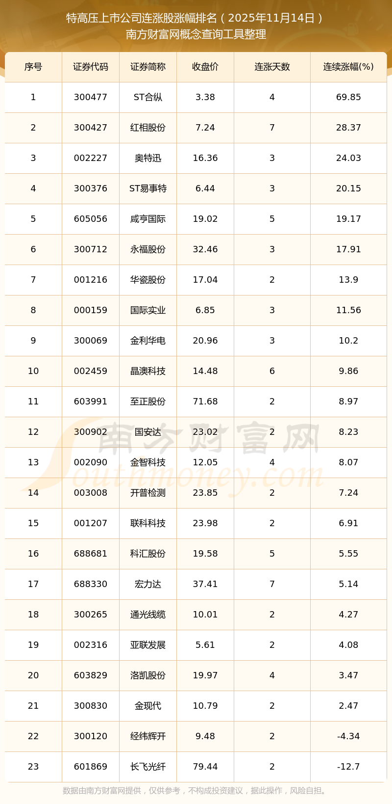 2025年11月14日特高壓上市公司連漲股漲幅排名