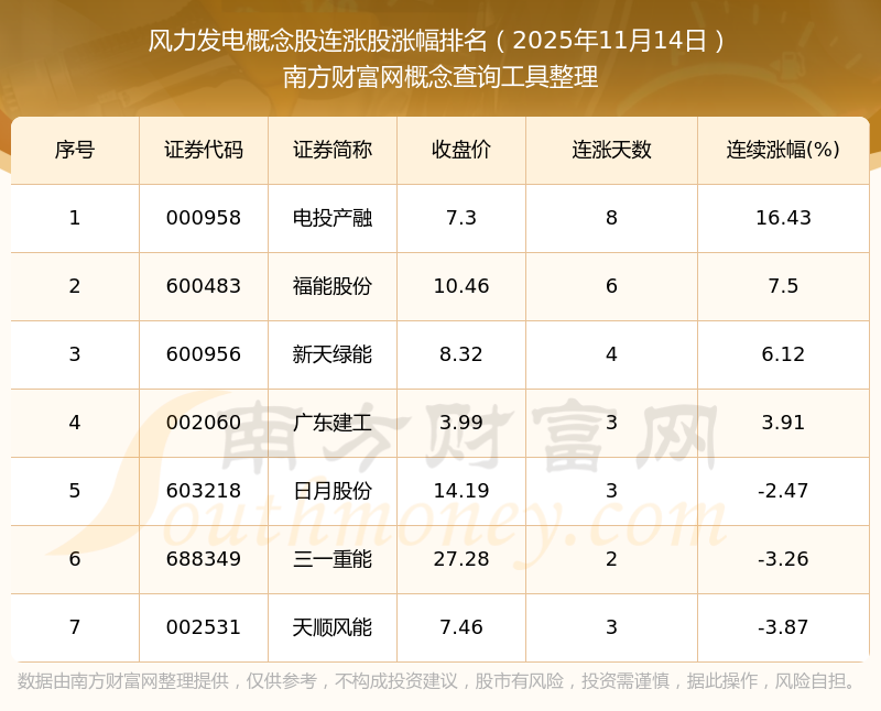 根據(jù)南方財(cái)富網(wǎng)概念查詢工具數(shù)據(jù)統(tǒng)計(jì),截止2025年11月14日收盤,風(fēng)力發(fā)電概念股共有7只個股實(shí)現(xiàn)連漲。其中連續(xù)漲幅較大的個股有電投產(chǎn)融、福能股份、新天綠能等,連續(xù)漲幅分別為16.43%、7.50%、6.12%。