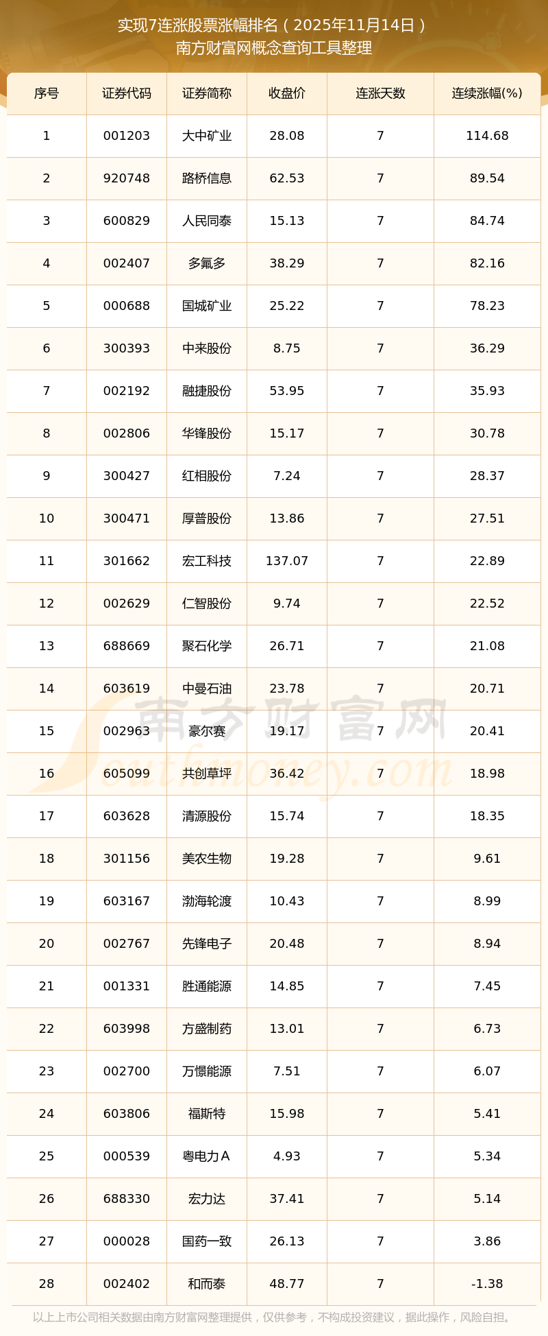 2025年11月14日實(shí)現(xiàn)7連漲股票漲幅排名