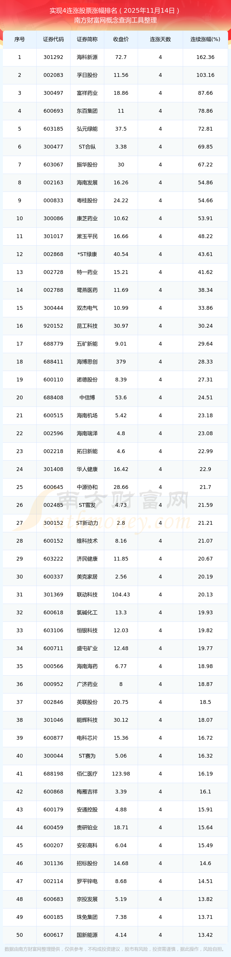2025年11月14日實(shí)現(xiàn)4連漲股票漲幅排名