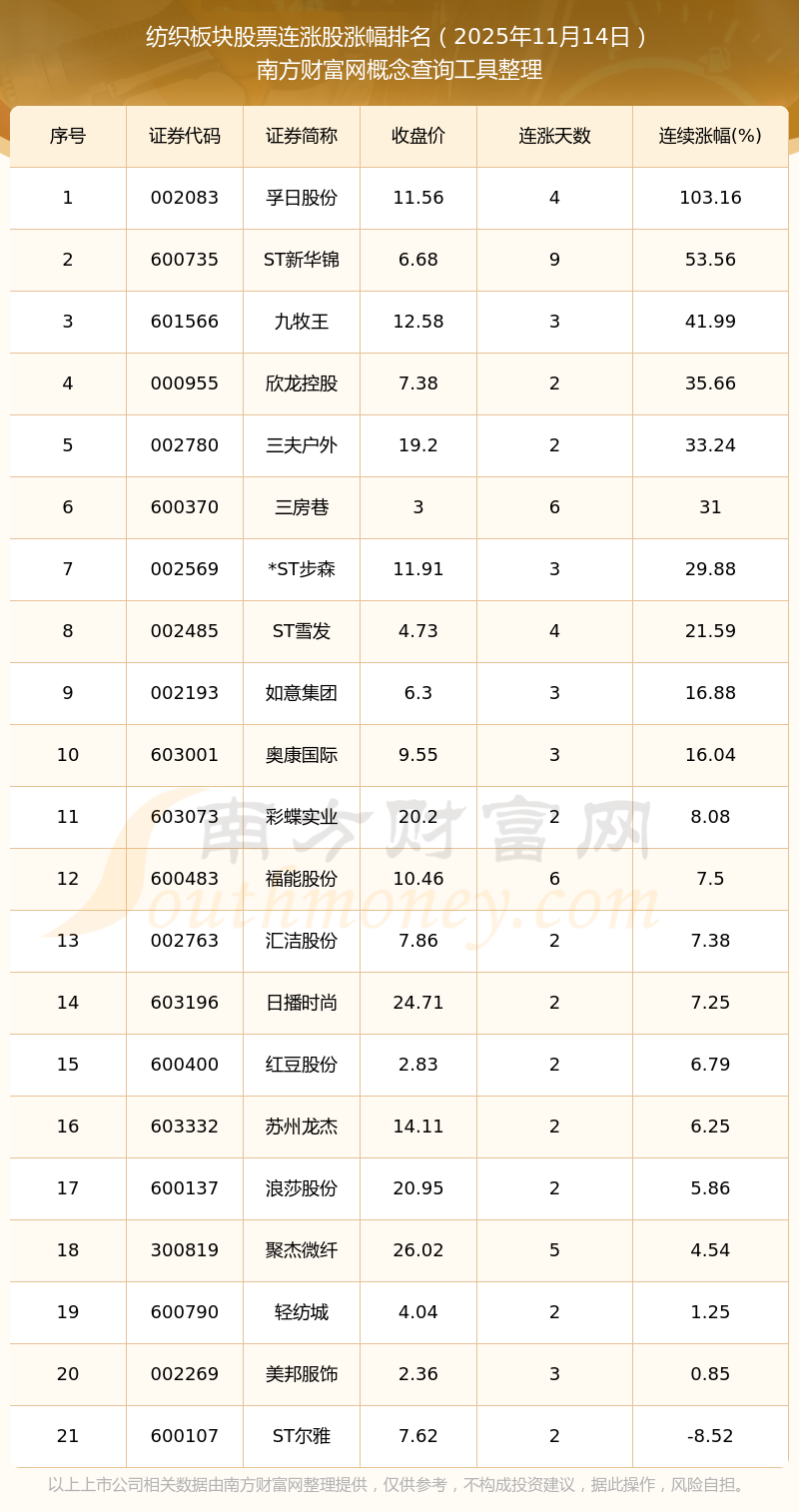 2025年11月14日紡織板塊股票連漲股漲幅排名