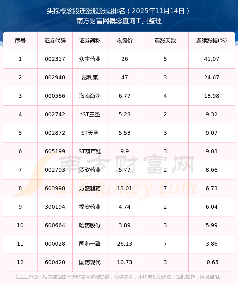2025年11月14日頭孢概念股連漲股漲幅排名