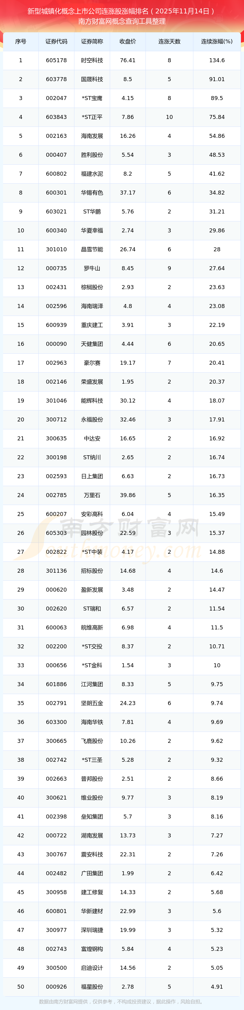 2025年11月14日新型城鎮(zhèn)化概念上市公司連漲股漲幅排名