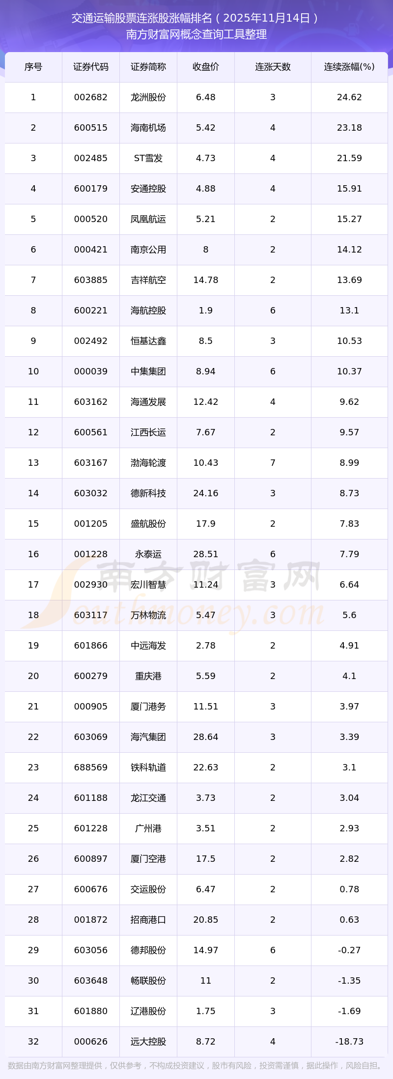 2025年11月14日交通運(yùn)輸股票連漲股票漲幅排名