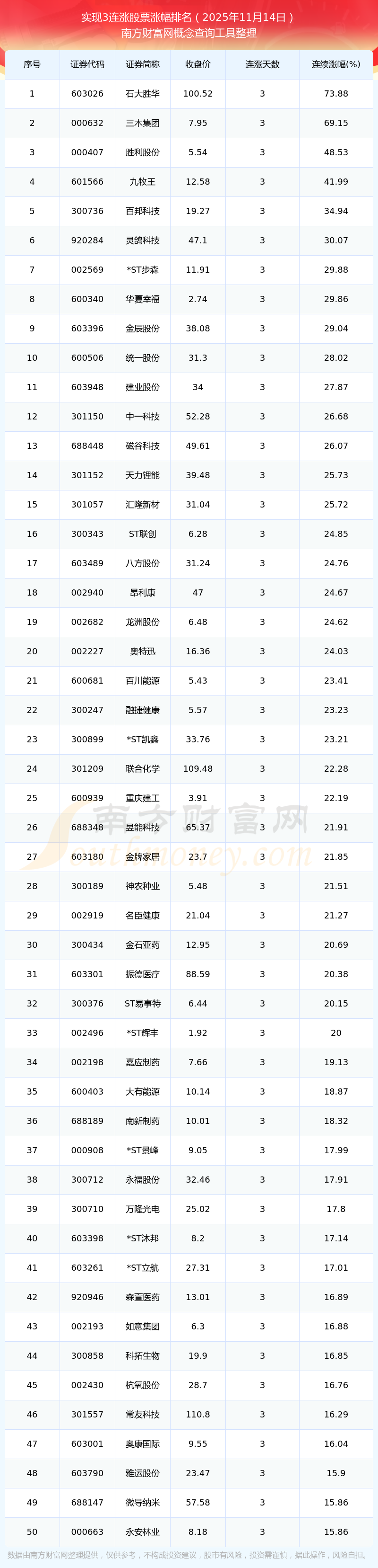 2025年11月14日連漲3天的股票漲幅排名