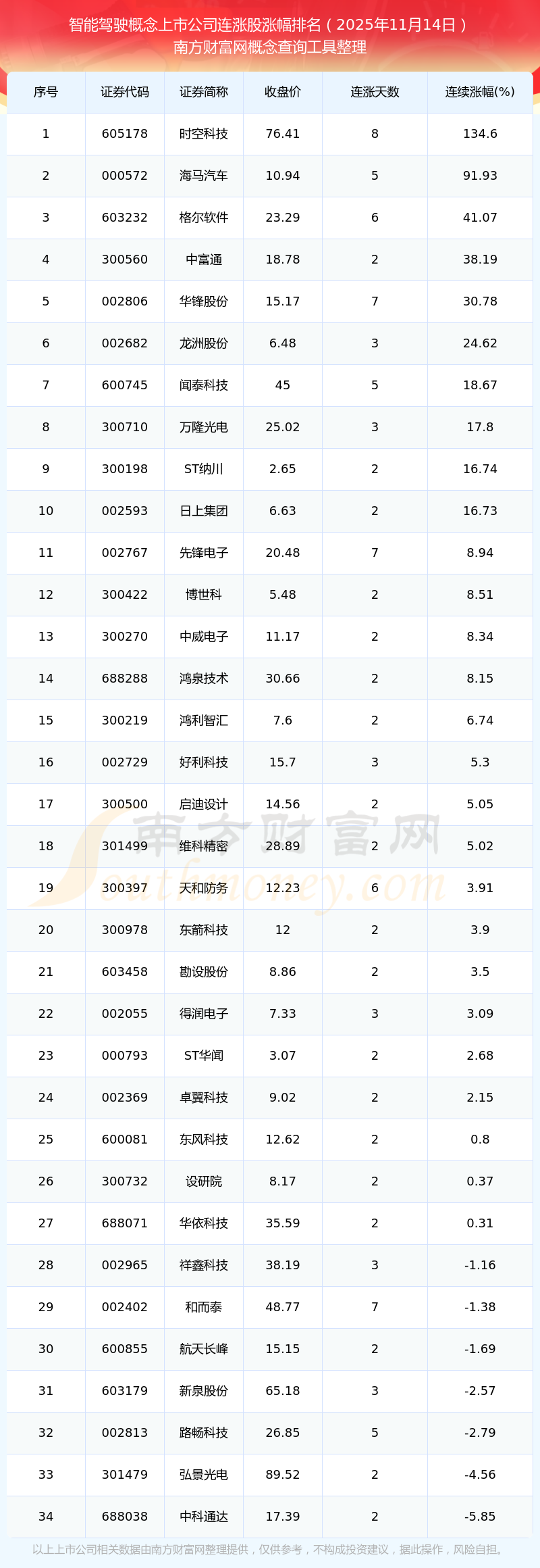 2025年11月14日智能駕駛概念上市公司連漲股漲幅排名
