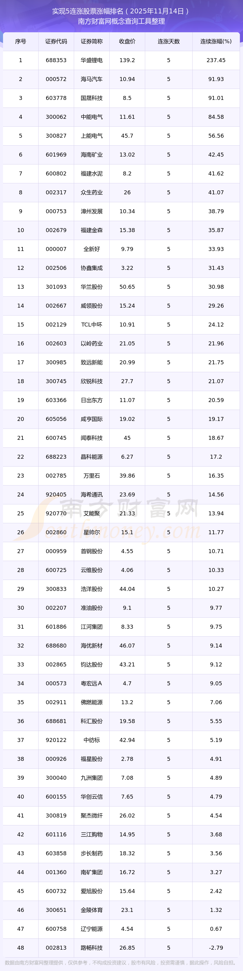 根據(jù)南方財(cái)富網(wǎng)概念查詢工具數(shù)據(jù)統(tǒng)計(jì),截止2025年11月14日收盤,共有48只個(gè)股實(shí)現(xiàn)5天連漲。其中連續(xù)漲幅較大的個(gè)股有華盛鋰電、海馬汽車、國晟科技等,連續(xù)漲幅分別為237.45%、91.93%、91.01%。