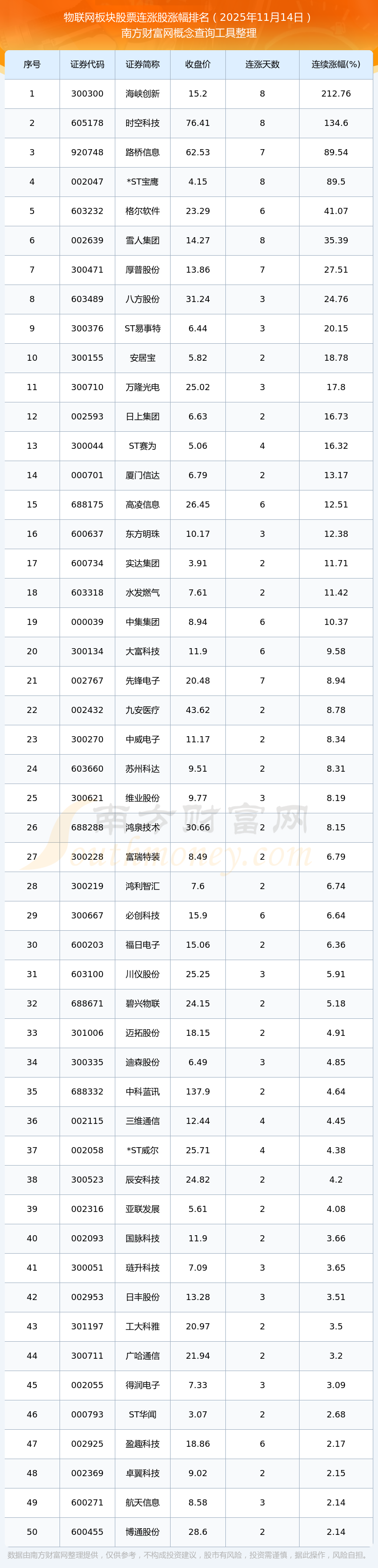 2025年11月14日物聯(lián)網(wǎng)板塊股票連漲股漲幅排名