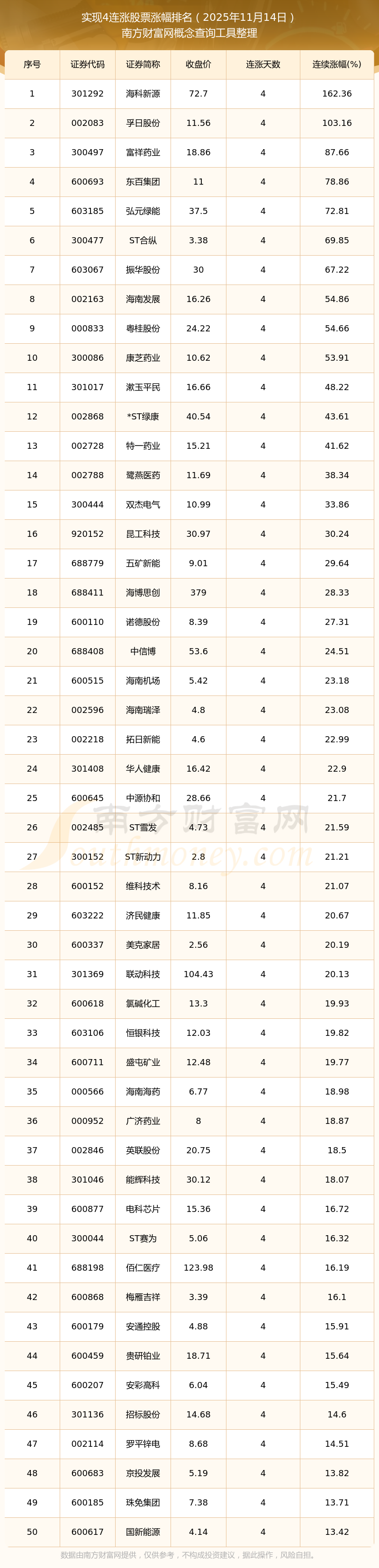2025年11月14日實(shí)現(xiàn)4連漲股票漲幅排名