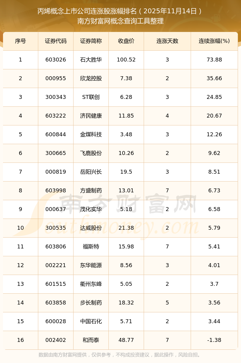 2025年11月14日丙烯概念上市公司連漲股漲幅排名