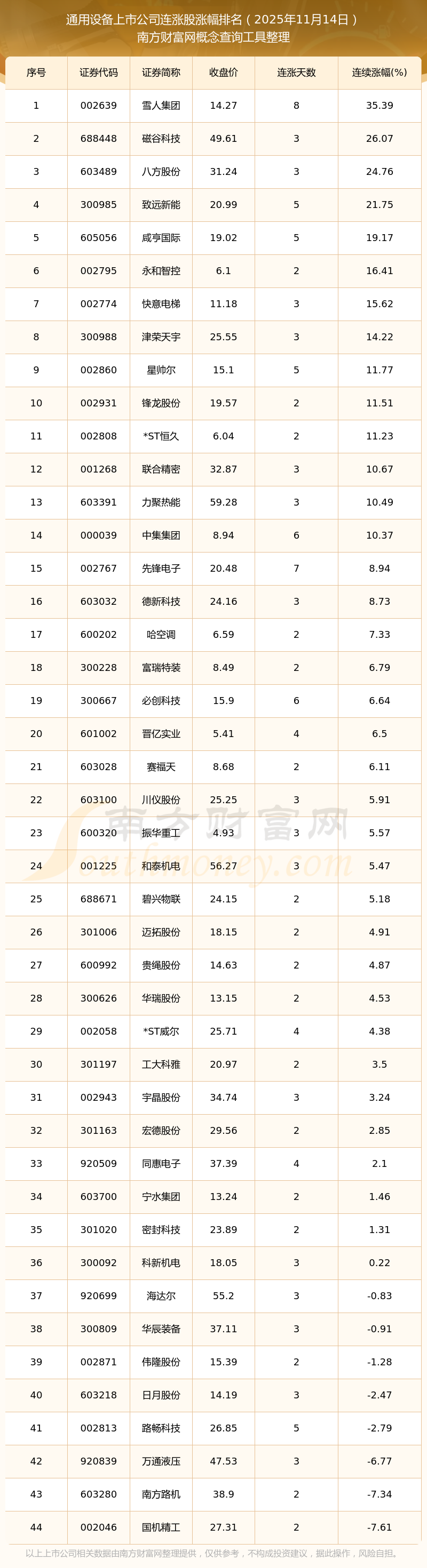 2025年11月14日通用設(shè)備上市公司連漲股漲幅排名