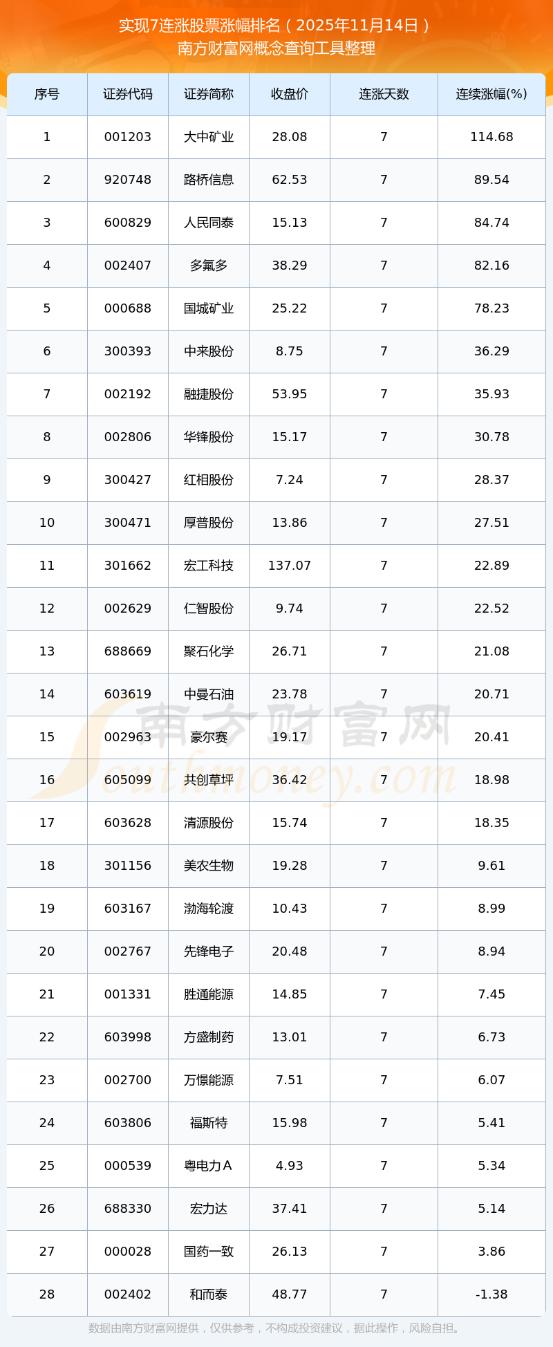 根據(jù)南方財富網(wǎng)概念查詢工具數(shù)據(jù)統(tǒng)計,截止2025年11月14日收盤,共有28只個股實現(xiàn)7天連漲。其中連續(xù)漲幅較大的個股有大中礦業(yè)、路橋信息、人民同泰等,連續(xù)漲幅分別為114.68%、89.54%、84.74%。
