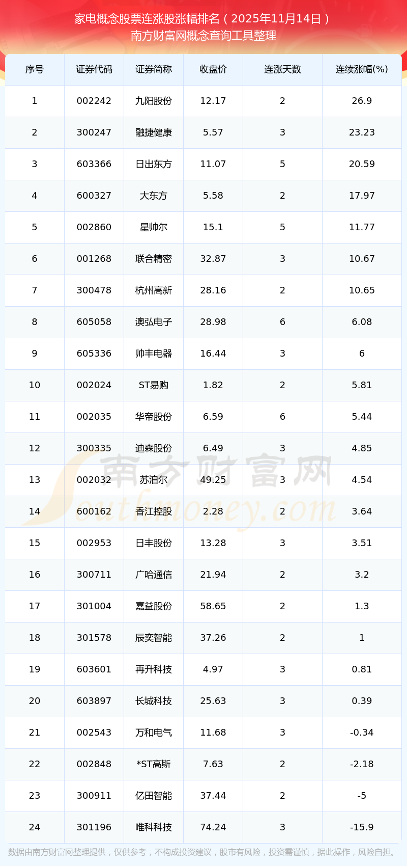 根據(jù)南方財(cái)富網(wǎng)概念查詢工具數(shù)據(jù)統(tǒng)計(jì),截止2025年11月14日收盤,家電概念股票共有24只個(gè)股實(shí)現(xiàn)連漲。其中連續(xù)漲幅較大的個(gè)股有九陽(yáng)股份、融捷健康、日出東方等,連續(xù)漲幅分別為26.90%、23.23%、20.59%。