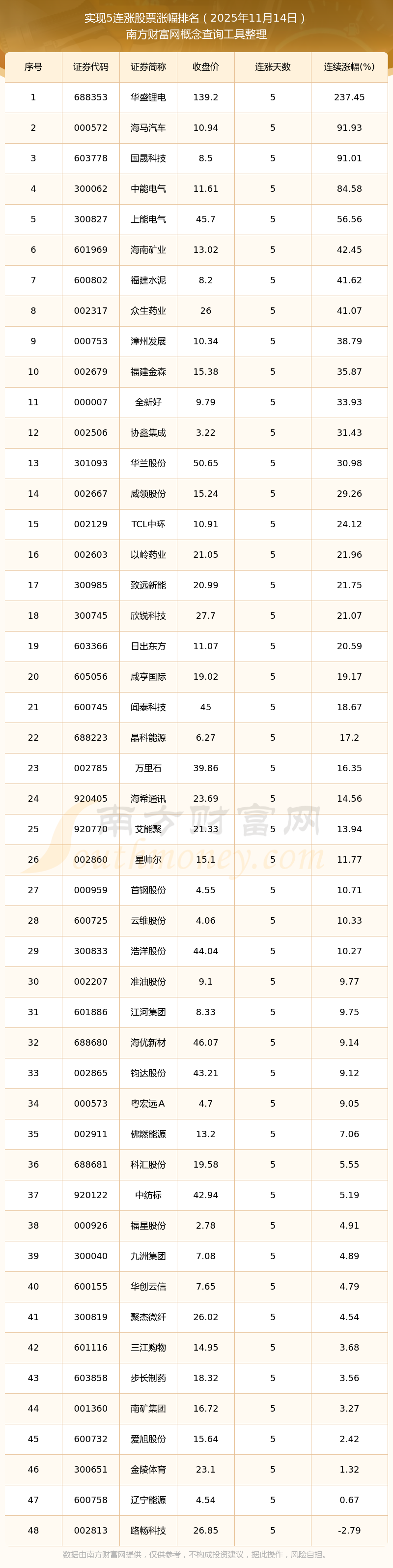根據(jù)南方財(cái)富網(wǎng)概念查詢(xún)工具數(shù)據(jù)統(tǒng)計(jì),截止2025年11月14日收盤(pán),共有48只個(gè)股實(shí)現(xiàn)5天連漲。其中連續(xù)漲幅較大的個(gè)股有華盛鋰電、海馬汽車(chē)、國(guó)晟科技等,連續(xù)漲幅分別為237.45%、91.93%、91.01%。