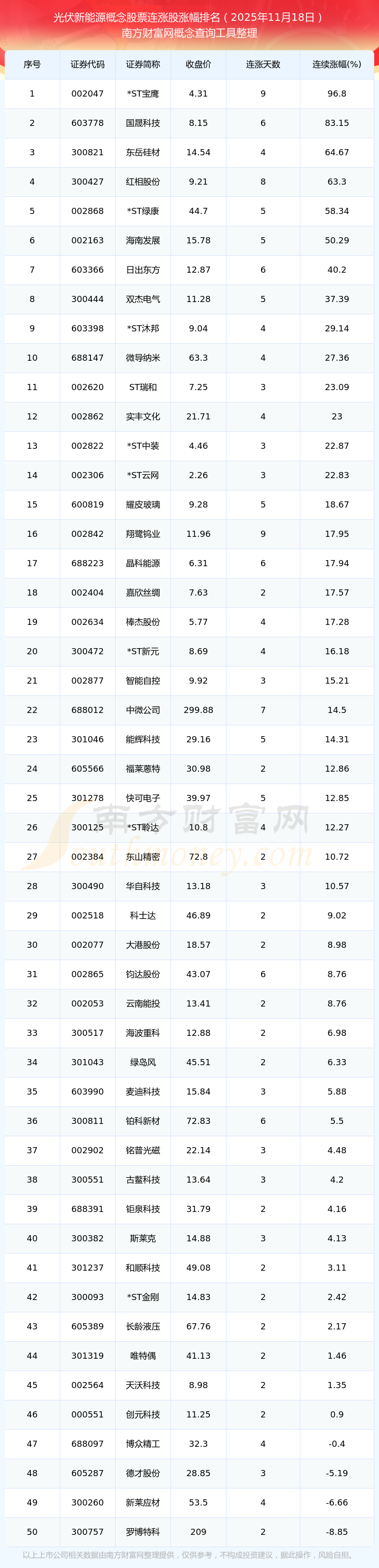 根據(jù)南方財(cái)富網(wǎng)概念查詢工具數(shù)據(jù)統(tǒng)計(jì),截止2025年11月18日收盤(pán),光伏新能源概念股票共有51只個(gè)股實(shí)現(xiàn)連漲。其中連續(xù)漲幅較大的個(gè)股有*ST寶鷹、國(guó)晟科技、東岳硅材等,連續(xù)漲幅分別為96.80%、83.15%、64.67%。