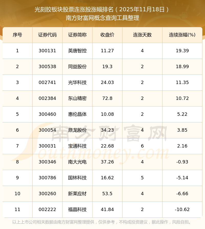 2025年11月18日光刻膠板塊股票連漲股漲幅排名