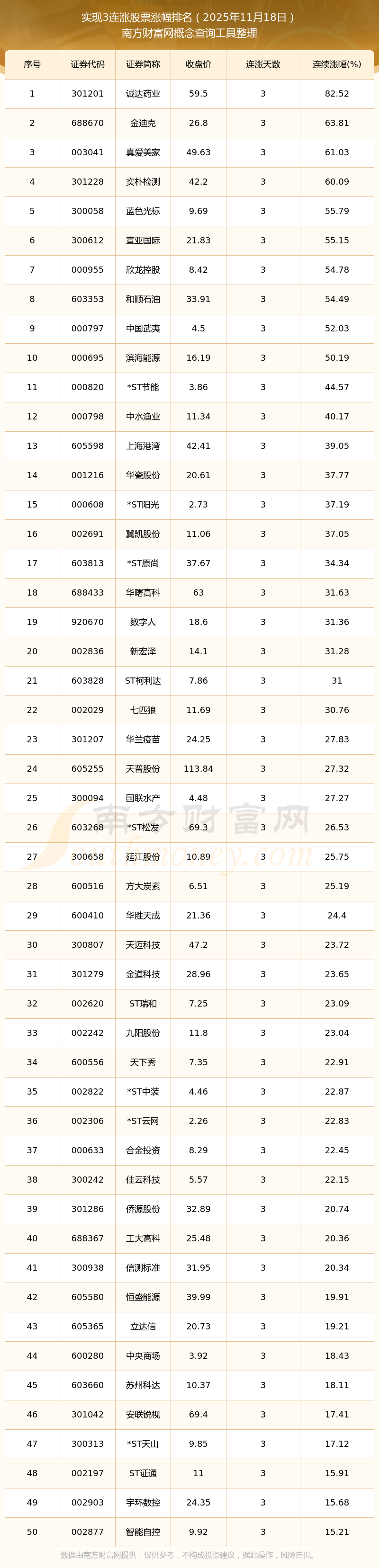 2025年11月18日實(shí)現(xiàn)3連漲股票漲幅排名