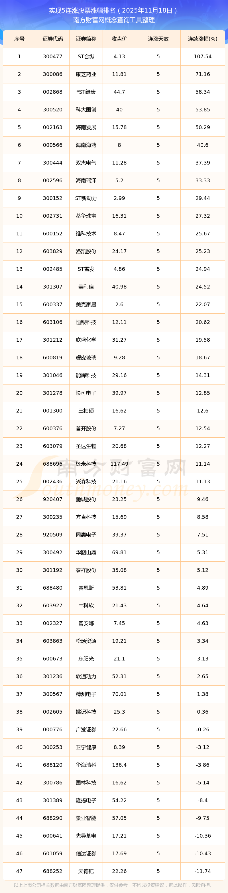 根據(jù)南方財富網(wǎng)概念查詢工具數(shù)據(jù)統(tǒng)計,截止2025年11月18日收盤,共有47只個股實現(xiàn)5天連漲。其中連續(xù)漲幅較大的個股有ST合縱、康芝藥業(yè)、*ST綠康等,連續(xù)漲幅分別為107.54%、71.16%、58.34%。