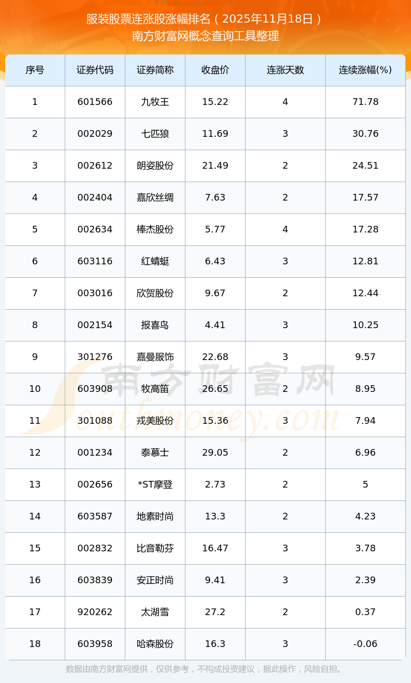 根據(jù)南方財富網(wǎng)概念查詢工具數(shù)據(jù)統(tǒng)計,截止2025年11月18日收盤,服裝股票共有18只個股實現(xiàn)連漲。其中連續(xù)漲幅較大的個股有九牧王、七匹狼、朗姿股份等,連續(xù)漲幅分別為71.78%、30.76%、24.51%。