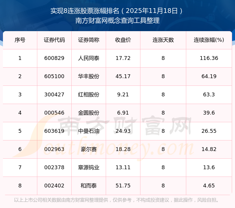 2025年11月18日實(shí)現(xiàn)8連漲股票漲幅排名