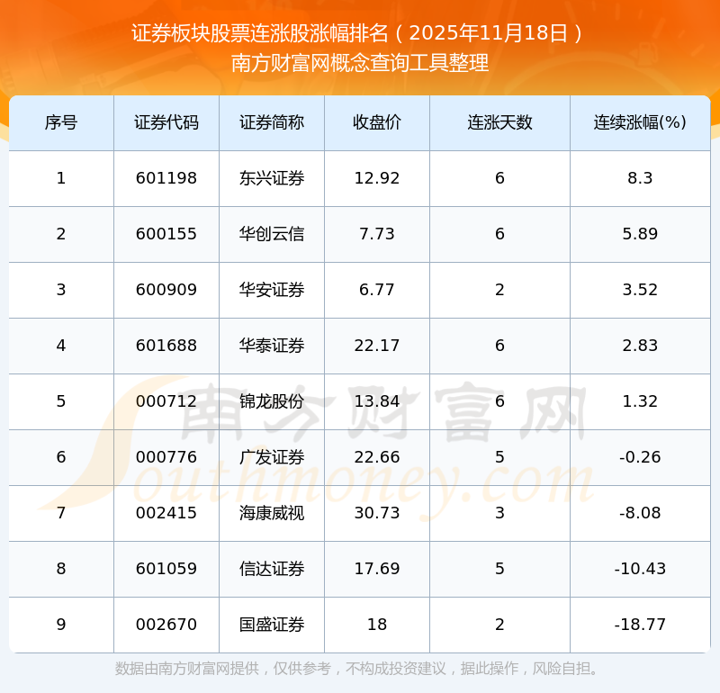2025年11月18日證券板塊股票連漲股漲幅排名