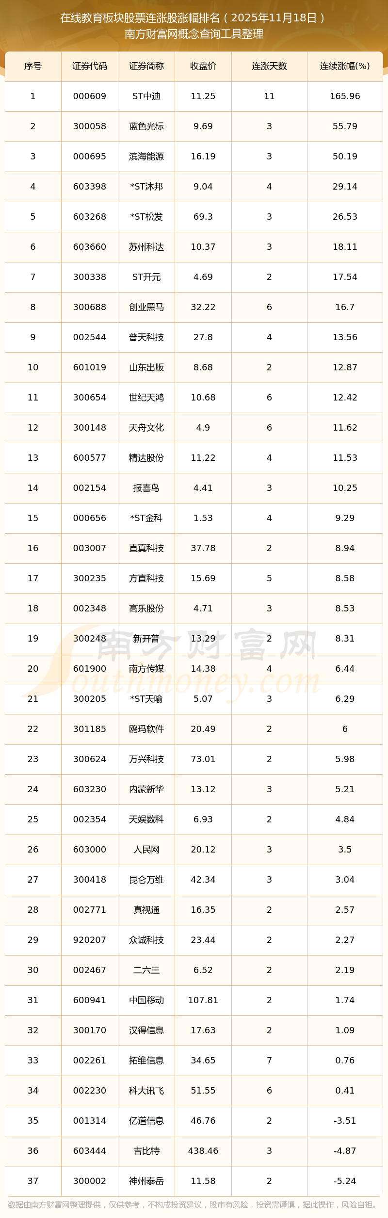 2025年11月18日在線教育板塊股票連漲股漲幅排名