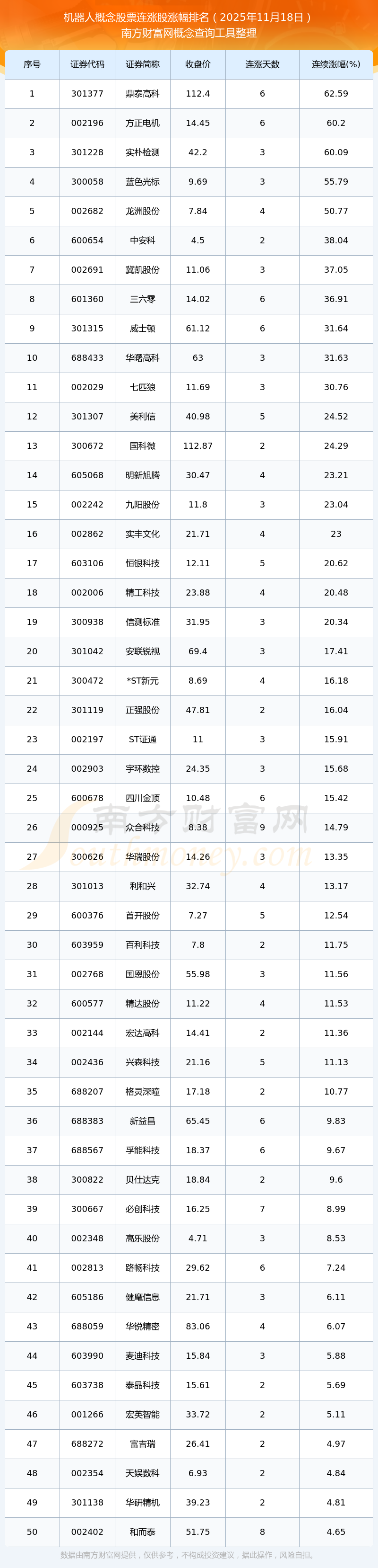 根據(jù)南方財(cái)富網(wǎng)概念查詢工具數(shù)據(jù)統(tǒng)計(jì),截止2025年11月18日收盤,機(jī)器人概念股票共有98只個(gè)股實(shí)現(xiàn)連漲。其中連續(xù)漲幅較大的個(gè)股有鼎泰高科、方正電機(jī)、實(shí)樸檢測等,連續(xù)漲幅分別為62.59%、60.20%、60.09%。