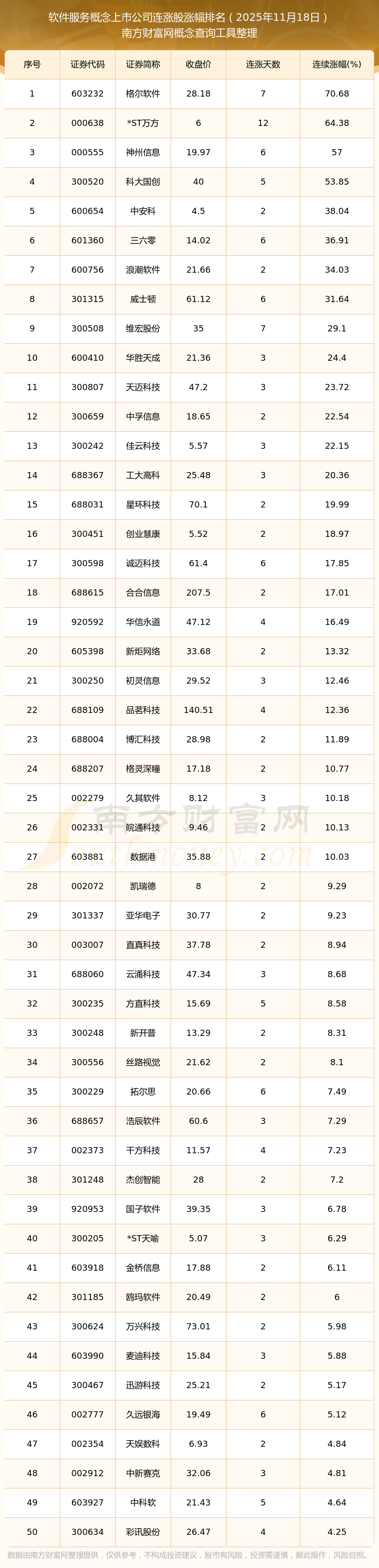 2025年11月18日軟件服務(wù)概念上市公司連漲股漲幅排名
