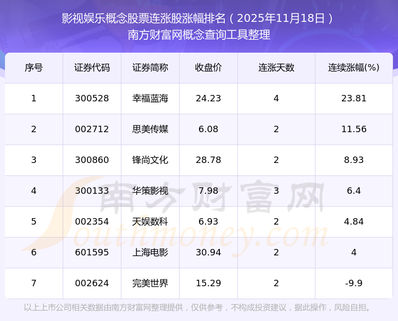 2025年11月18日影視娛樂概念股票連漲股漲幅排名