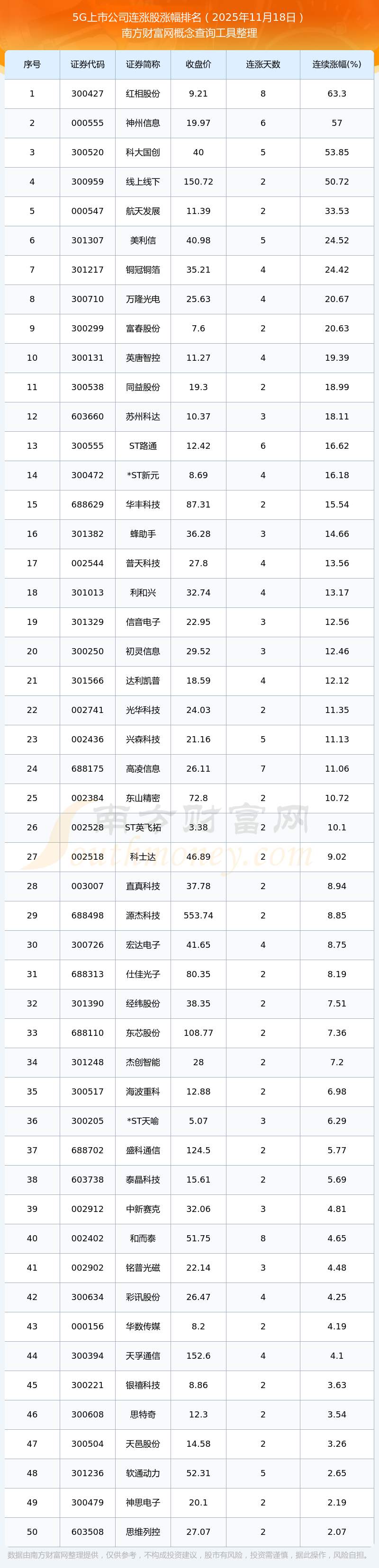 根據(jù)南方財富網(wǎng)概念查詢工具數(shù)據(jù)統(tǒng)計,截止2025年11月18日收盤,5G上市公司共有85只個股實現(xiàn)連漲。其中連續(xù)漲幅較大的個股有紅相股份、神州信息、科大國創(chuàng)等,連續(xù)漲幅分別為63.30%、57.00%、53.85%。