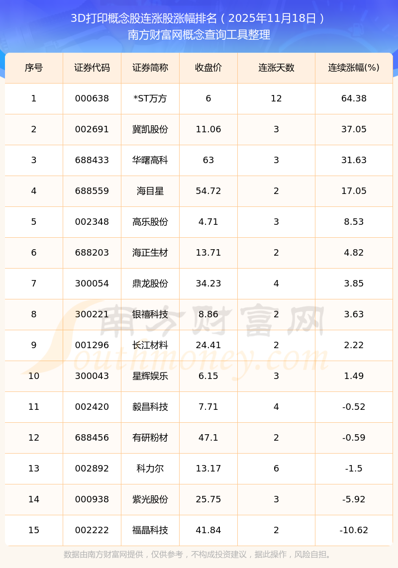根據(jù)南方財富網(wǎng)概念查詢工具數(shù)據(jù)統(tǒng)計,截止2025年11月18日收盤,3D打印概念股共有15只個股實現(xiàn)連漲。其中連續(xù)漲幅較大的個股有*ST萬方、冀凱股份、華曙高科等,連續(xù)漲幅分別為64.38%、37.05%、31.63%。