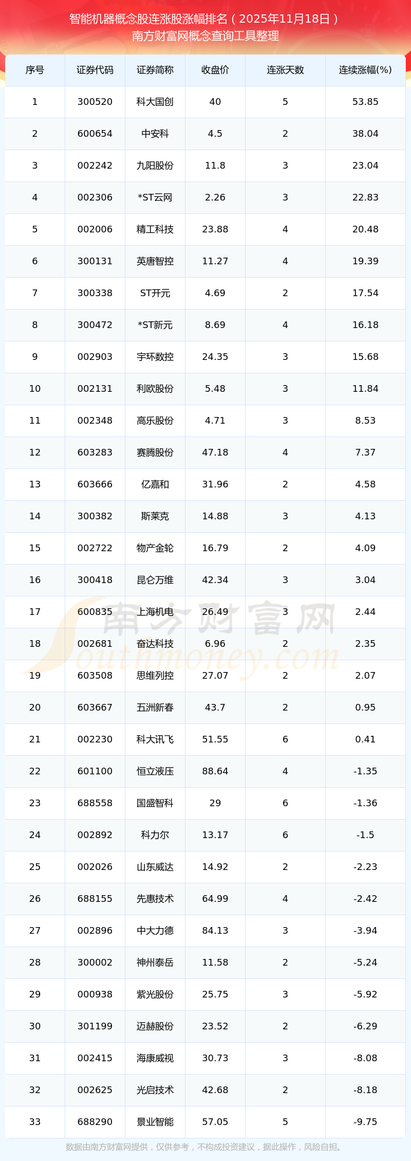根據南方財富網概念查詢工具數據統(tǒng)計,截止2025年11月18日收盤,智能機器概念股共有33只個股實現連漲。其中連續(xù)漲幅較大的個股有科大國創(chuàng)、中安科、九陽股份等,連續(xù)漲幅分別為53.85%、38.04%、23.04%。