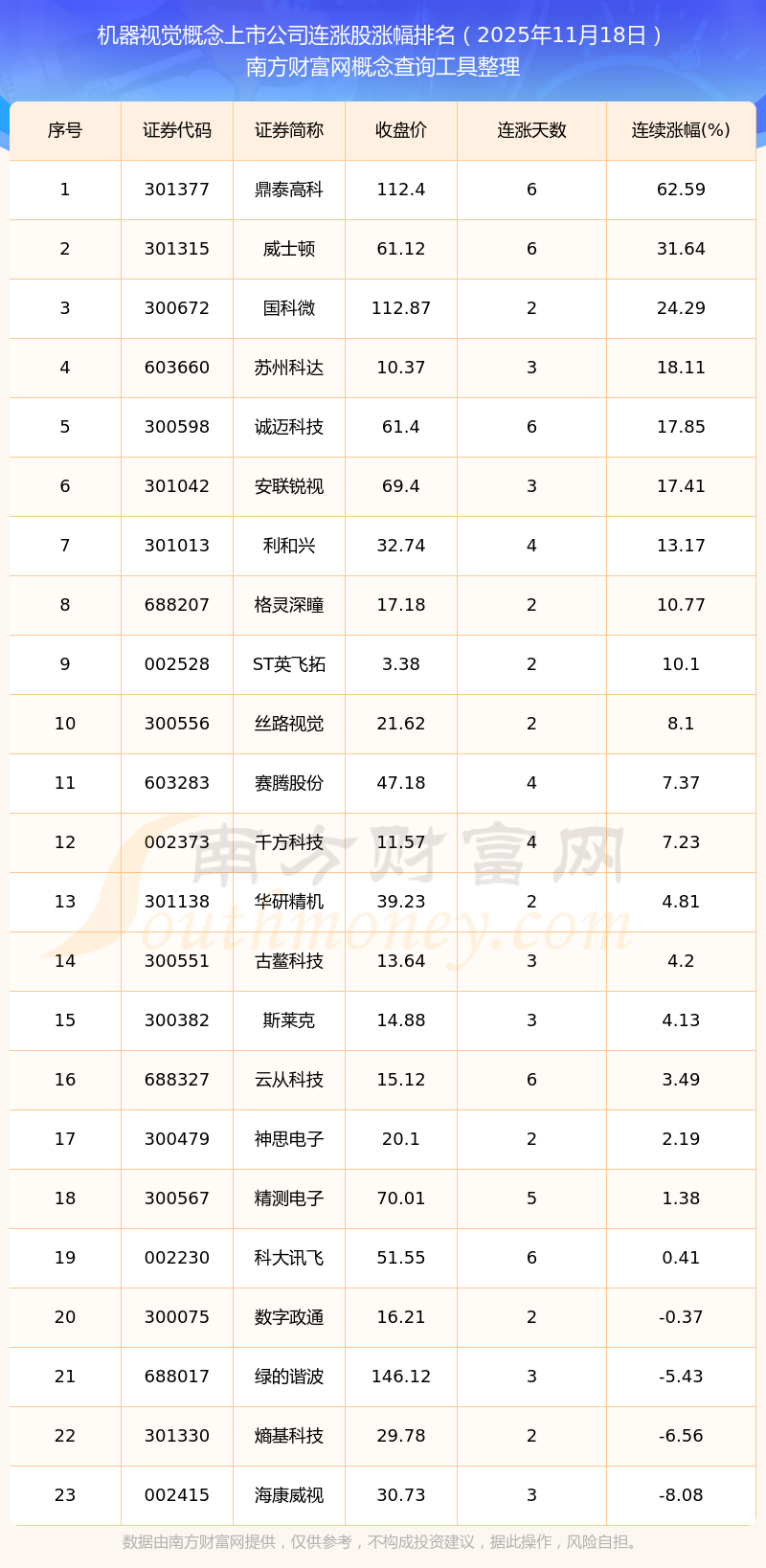 根據(jù)南方財富網(wǎng)概念查詢工具數(shù)據(jù)統(tǒng)計,截止2025年11月18日收盤,機器視覺概念上市公司共有23只個股實現(xiàn)連漲。其中連續(xù)漲幅較大的個股有鼎泰高科、威士頓、國科微等,連續(xù)漲幅分別為62.59%、31.64%、24.29%。