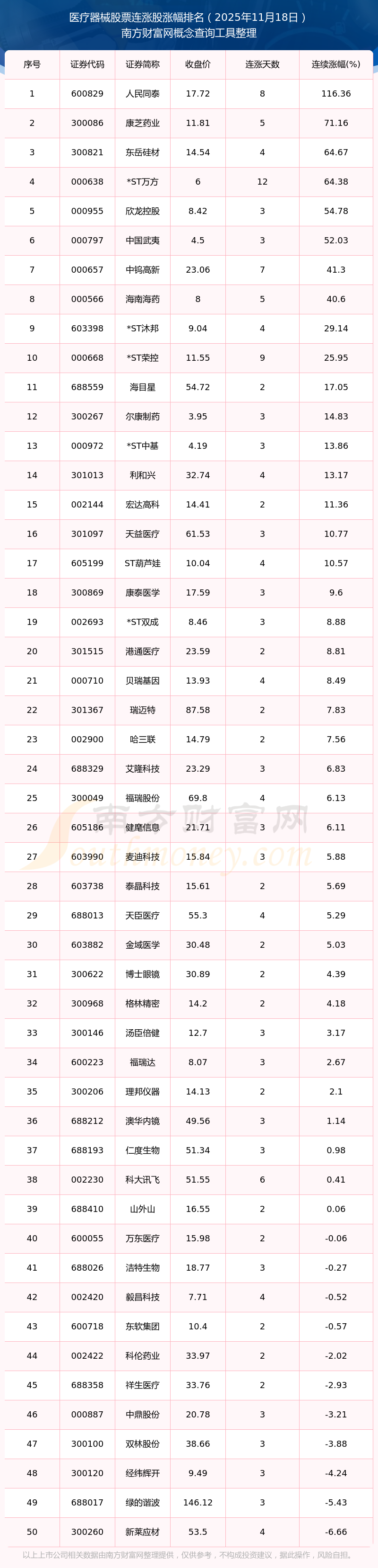 根據(jù)南方財富網(wǎng)概念查詢工具數(shù)據(jù)統(tǒng)計,截止2025年11月18日收盤,醫(yī)療器械股票共有50只個股實現(xiàn)連漲。其中連續(xù)漲幅較大的個股有人民同泰、康芝藥業(yè)、東岳硅材等,連續(xù)漲幅分別為116.36%、71.16%、64.67%。