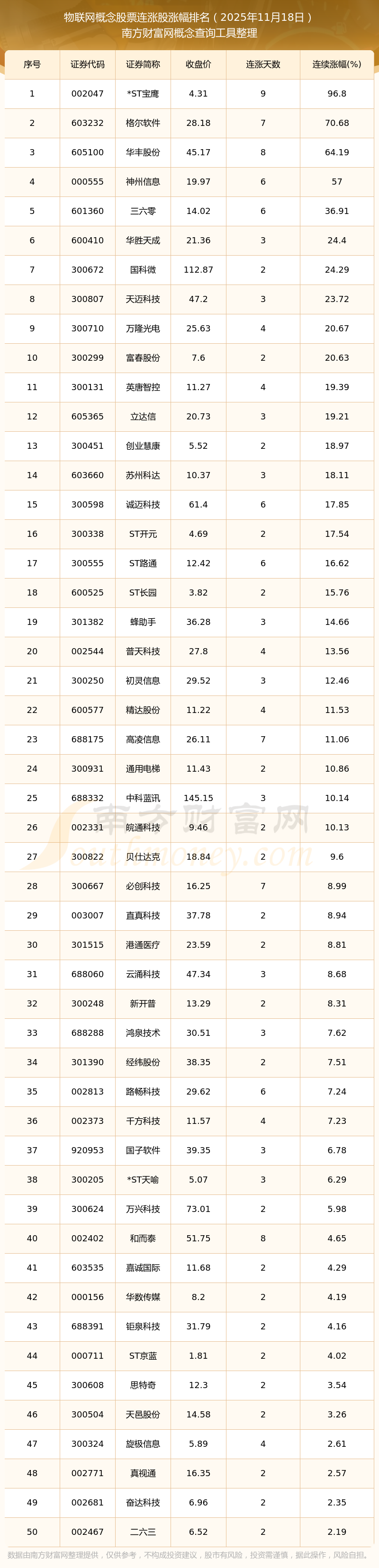2025年11月18日物聯(lián)網(wǎng)概念股票連漲股漲幅排名