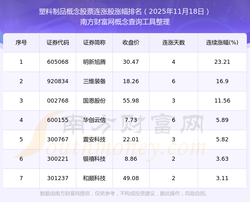 根據(jù)南方財(cái)富網(wǎng)概念查詢工具數(shù)據(jù)統(tǒng)計(jì),截止2025年11月18日收盤,塑料制品概念股票共有7只個(gè)股實(shí)現(xiàn)連漲。其中連續(xù)漲幅較大的個(gè)股有明新旭騰、三維裝備、國恩股份等,連續(xù)漲幅分別為23.21%、16.90%、11.56%。